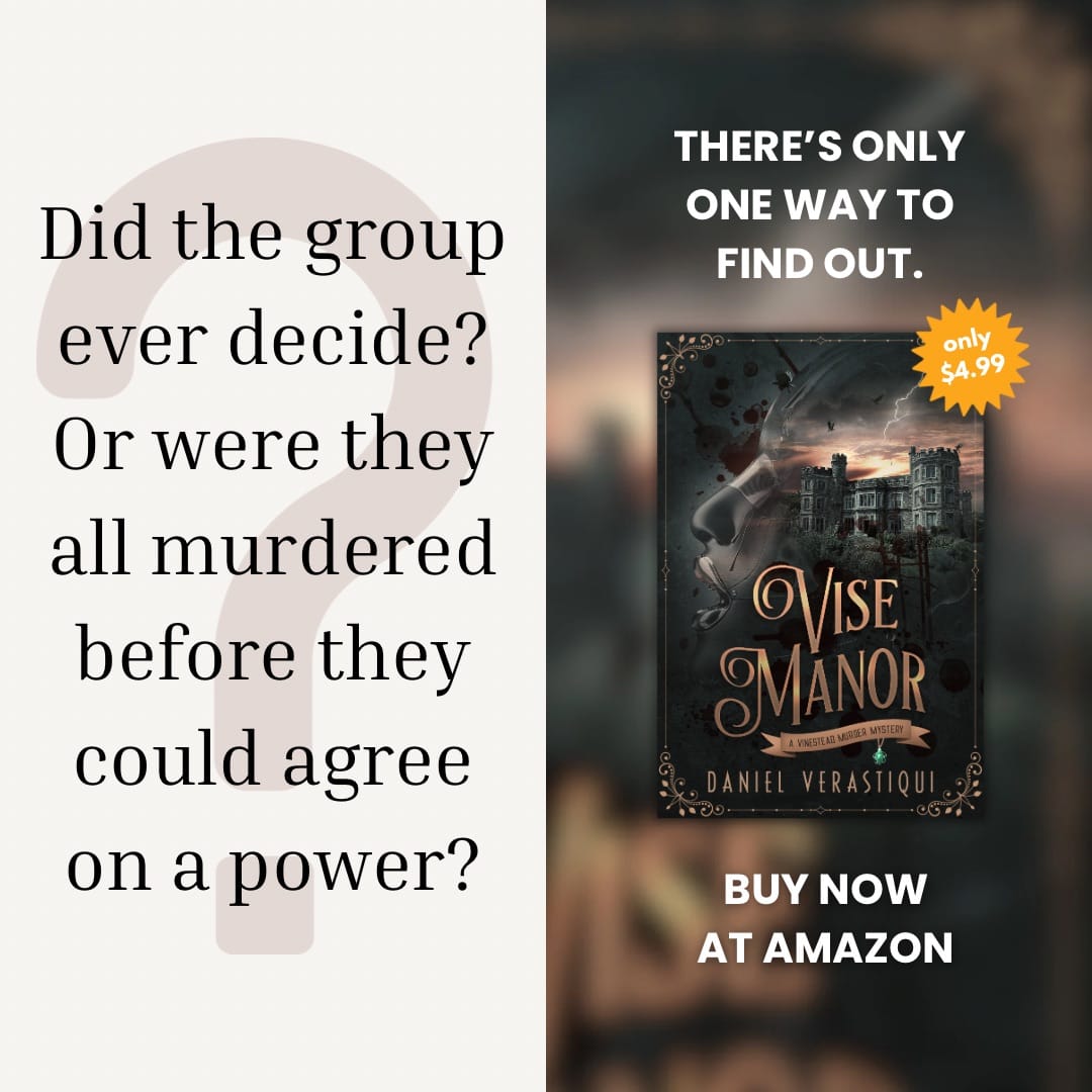 I first had this conversation about superpowers in the Dominican Republic at an awesome destination wedding in 2015, and when it came time to bring all the guests together for dinner in VISE MANOR years later, I knew exactly what they would talk about. Hopefully, it added some depth to the characters, but even if not, I was happy to immortalize that happy moment with friends. And we all lived!