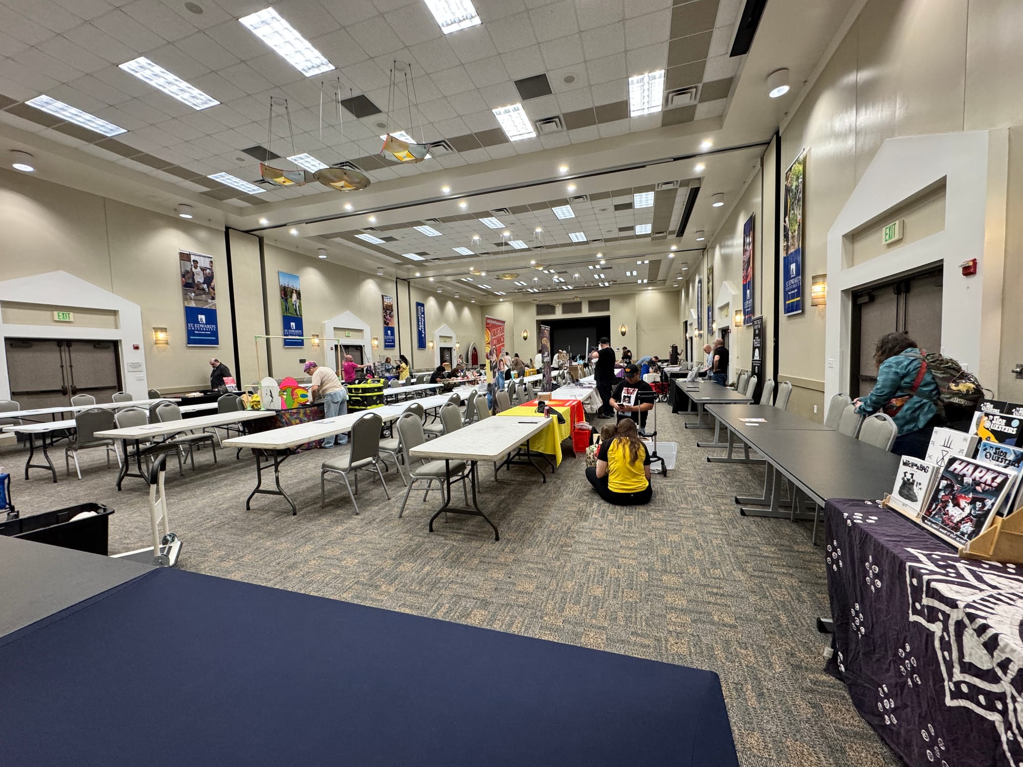 It's a bit of a drive down to St. Edward's University, and I spent most of that time reconsidering the Mexico Gambit. My new name would be Delgado Delgado, a retired bullfighter from Madrid, who spoke no English but also no Spanish, having taken a vow of silence after bulls murdered his entire family. Luckily, Waze had no knowledge of this plan, so it led me to campus and a small parking lot where I loaded up and headed for the Mabee Ballroom. There were already tons of people wheeling in their wares, and once I checked in, I made my way to the back corner to set up my table.