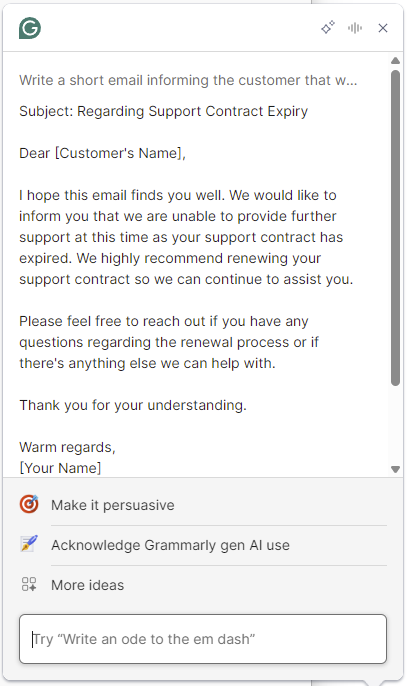 At my previous job, I encouraged my team to use Grammarly whenever they were writing anything customer-facing, such as a response to a trouble ticket or a knowledge base. We even paid for the highest tier, which allowed me to set team-wide tone and grammar rules. Suddenly, the team had a little assistant reminding them to use friendly, informative language with correct spelling and grammar. We even used generative AI to have Grammarly write examples of difficult emails to customers.