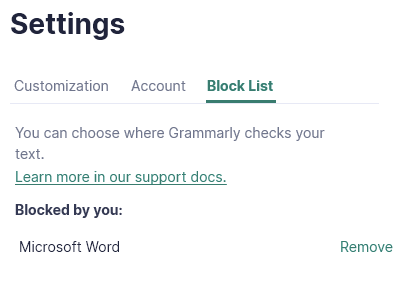 No. We do not use generative AI for creative writing. In any context. Ever. This is what got NaNoWriMo in trouble, but we'll get to that in a minute. What's important is that Grammarly can be disabled in certain programs, and unless you're running it at work, the first program you'll want to add to the block list is Microsoft Word.