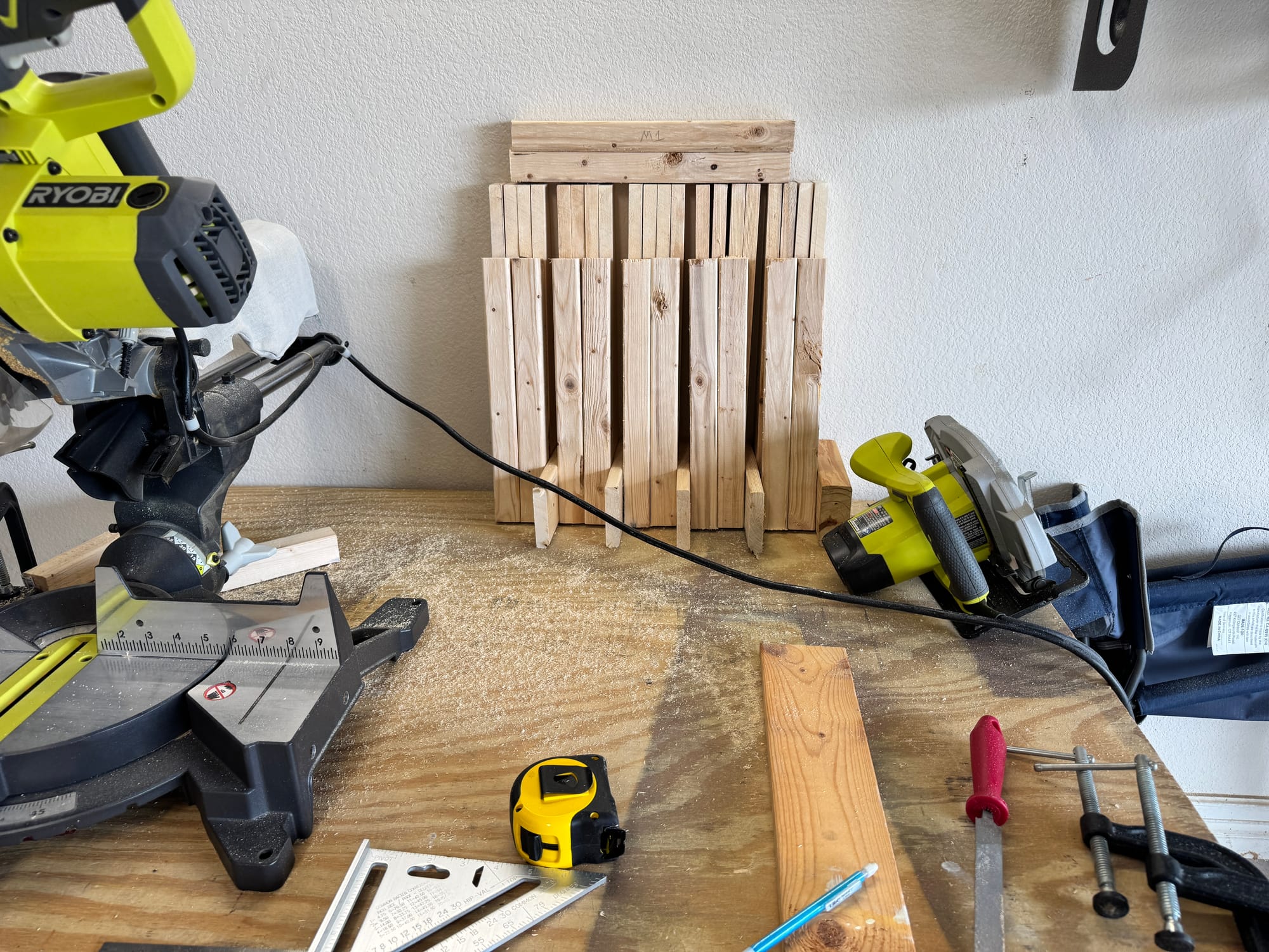 Cutting lots of arms, using clamps and t-squares... just like a real woodworker. I started out listening to the 1984 audiobook, but I switched over to music because the book was making me think too much, and the point of this was to not think.