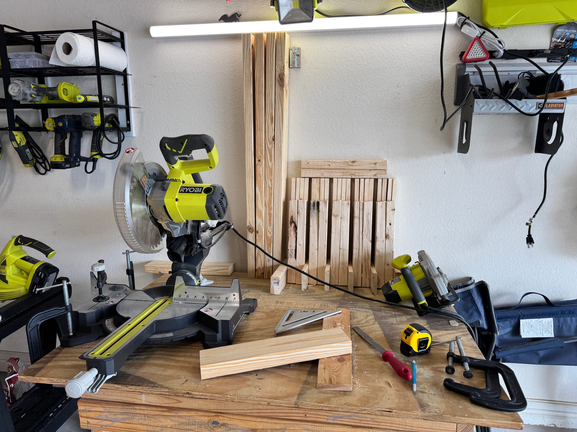 Lots of glue. Lots of screws. Four little baby versions just in case I wanted to extend the shelves all the way to the front of the garage.