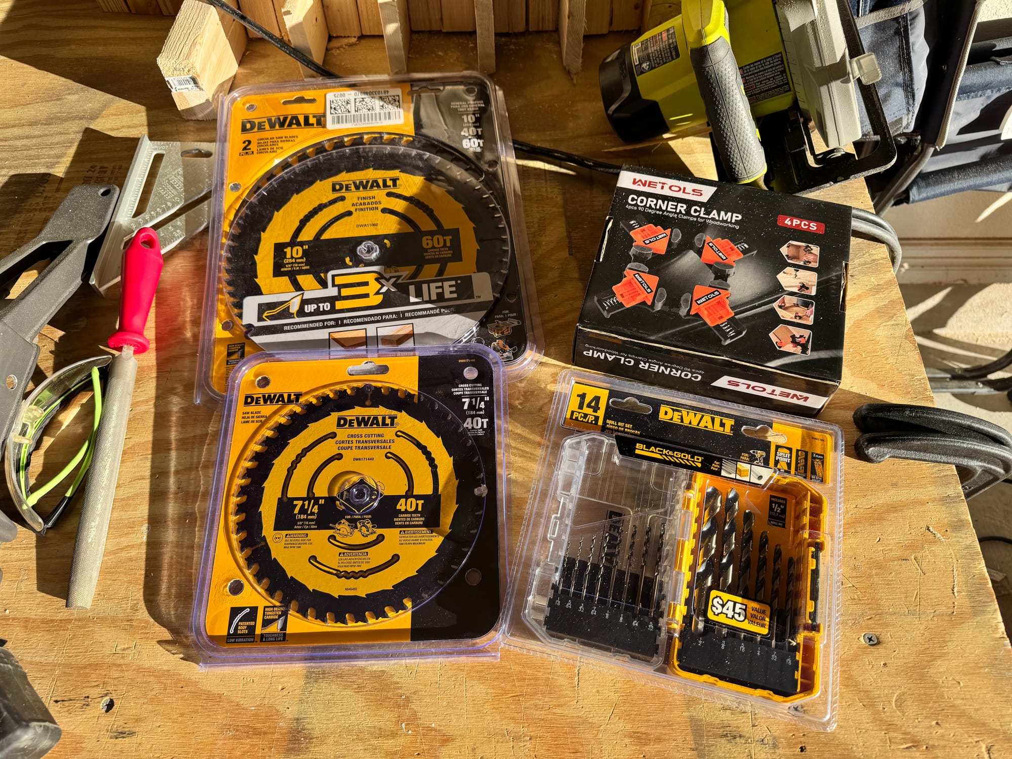 At some point, it occurred to me that both of my saws were almost 10 years old. They should probably have their blades replaced, so I ordered some from Amazon, along with drill bits and some corner clamps because I'm an impulse shopper.
