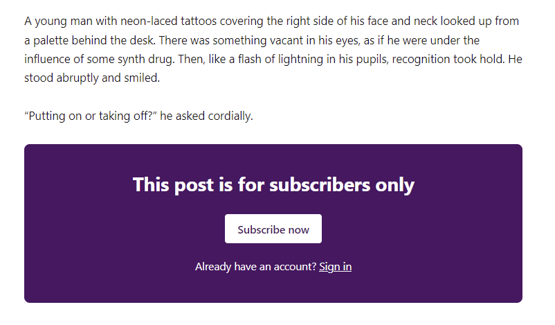 As long as that possibility exists, authors (and other creatives) need to take proactive steps to safeguard their work on their websites. Platforms like Squarespace and WordPress (via plugins) can password-protect pages, and if you're rolling your own HTML, you can have users enter a password (which I've done). But those solutions leave something on the table: forming a direct relationship with your audience.