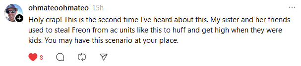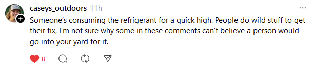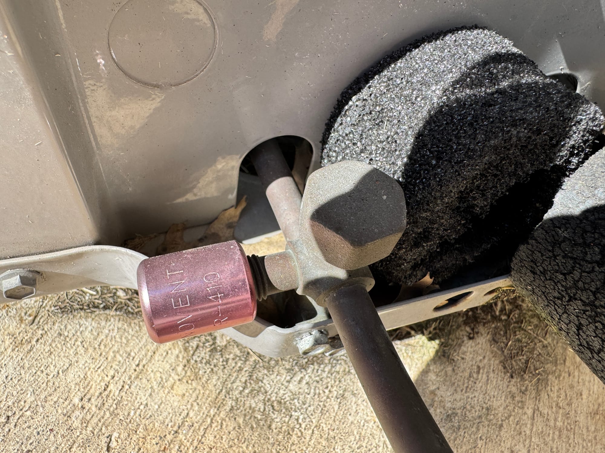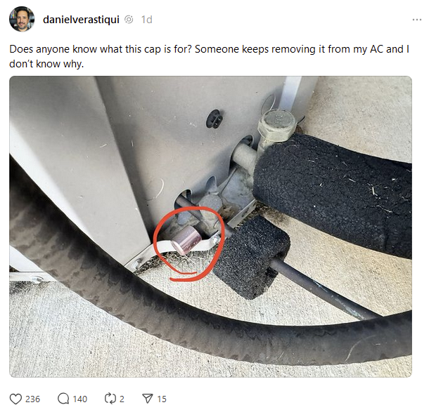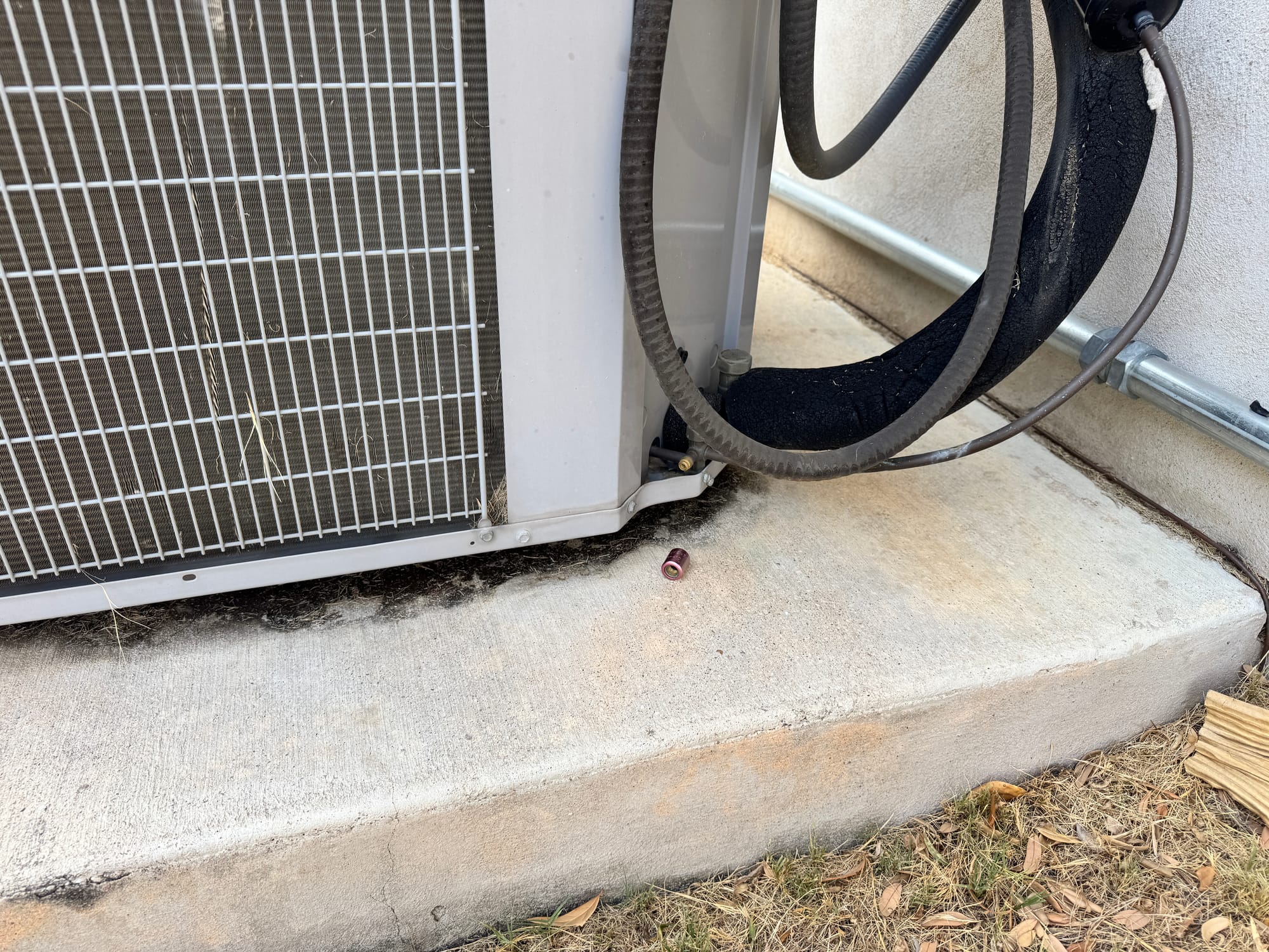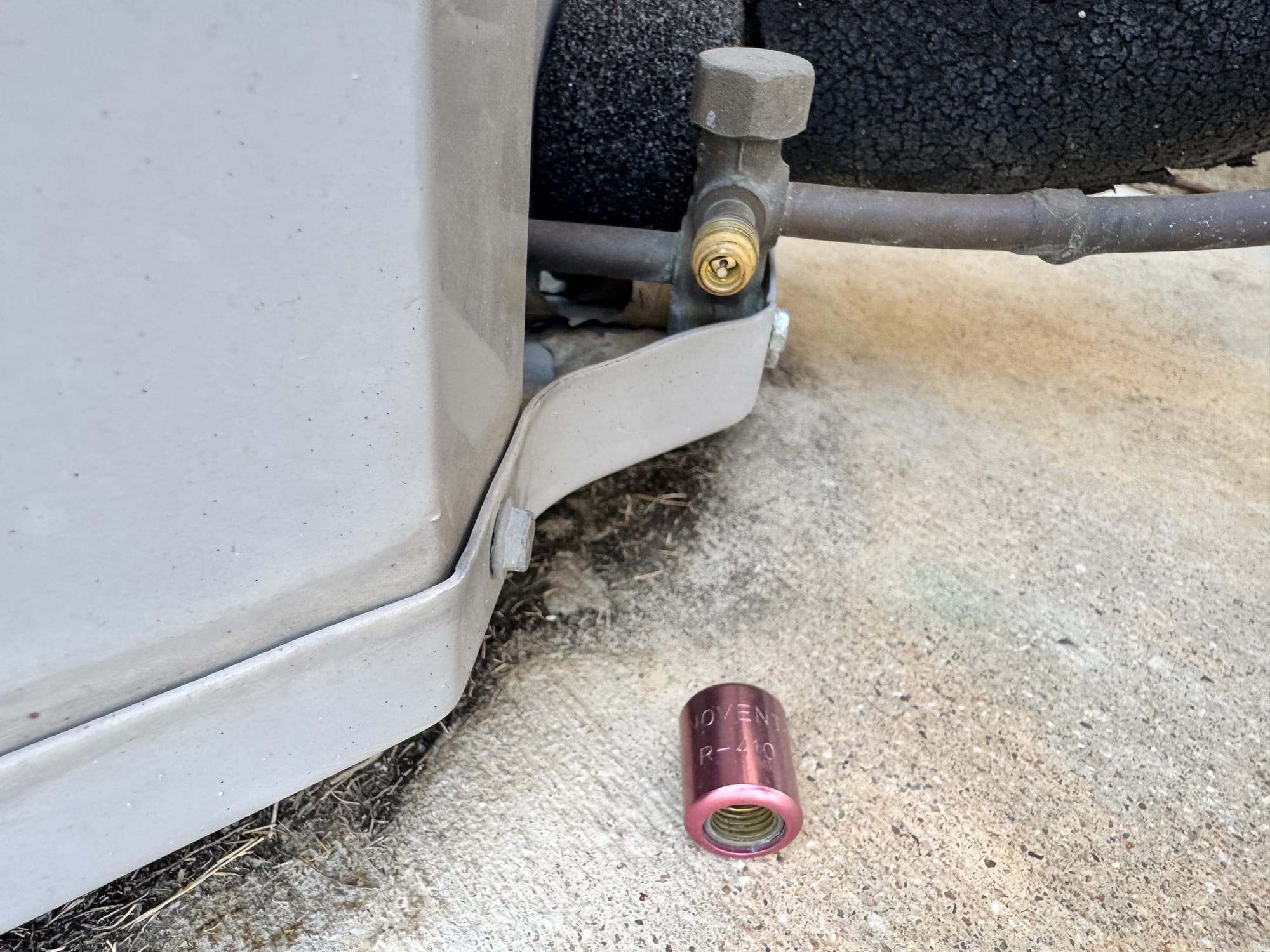 Last month, as I was tending the grounds (walking in my yard), I noticed a shiny cylinder standing upright on the stylish concrete block that holds my air conditioning unit. Upon further inspection, I realized it came from a small valve on the AC itself. When I tried to replace it, the cap became stuck and could no longer be removed. I assumed the cap simply fell off and that a good Samaritan had placed it on the concrete slab so I wouldn't lose it. And that was the end of it.