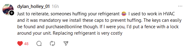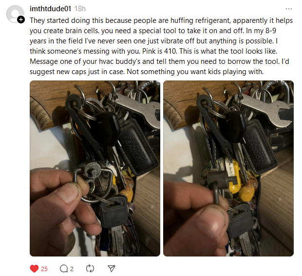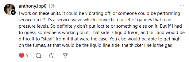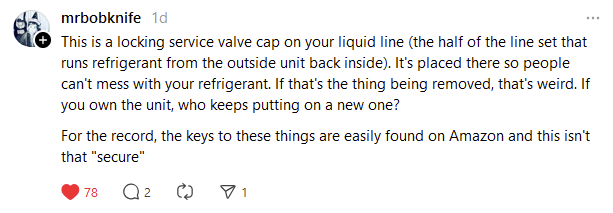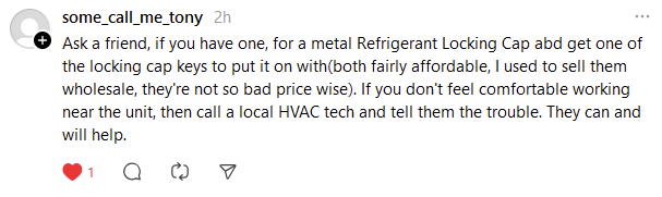 According to Google's ultra-reliable AI Overview feature, A locking service valve cap on an air conditioner is a tamper-resistant cap that prevents unauthorized access to the refrigerant valve. The cap can only be installed or removed with a special tool or key.